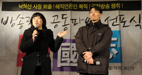 | ▲ 5일 서울 종로구 보신각 앞에서 열린 '방송 3사(KBS, MBC, YTN) 공동파업 선포식'에서 통합진보당 이정희 대표와 서기호 전 판사가 지지를 표명하고 있다. (뉴시스) | ||