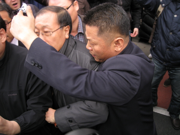 정영하 노조 위원장은 김 사장 앞을 막아서며 “대화하자”고 제안했다. 이에 대해 김 사장은 “위원장하고 나하고 커피숍에 가서 얘기하자”고 말했다. 이에 정영하 위원장이 “노조원들이 2시간이나 기다렸다. 공개적으로 얘기하자”고 재차 요구했으나, 김 사장은 더 이상 답하지 않았다. “사퇴하시겠냐”, “왜 사퇴하지 않냐”는 추궁에도 묵묵부답이었다.