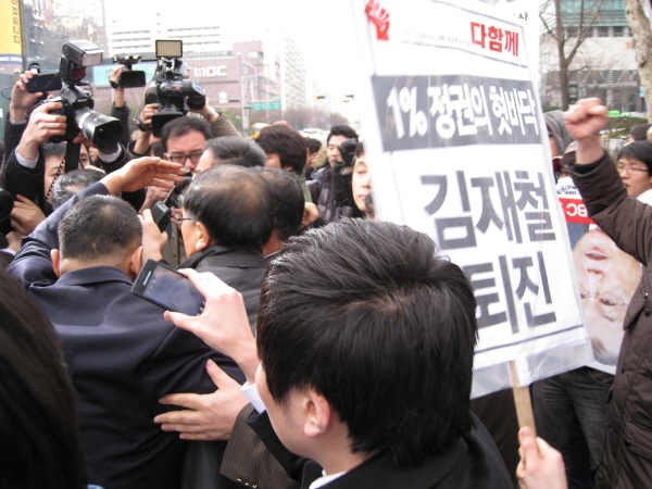 노조원들은 “김재철은 물러가라”고 외치며 계속 해서 김 사장 주위를 에워쌌지만, 물리적인 충돌은 일어나지 않았다. 김 사장은 MBC 앞 사거리에서 대기 중이던 경찰 병력들의 도움으로 겨우 MBC 사옥 안으로 들어갈 수 있었다.