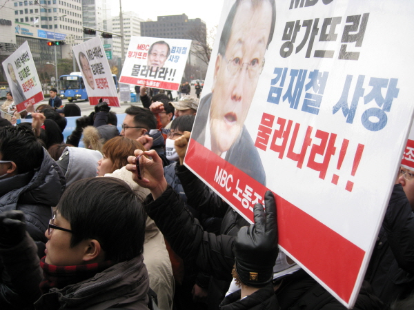 ▲ 김재철 사장이 방문진 현안보고를 마치고 나오자 기다리고 있던 노조원 300여명이 주위를 에워싸고 '김재철은 물러가라'고 외치고 있다. |