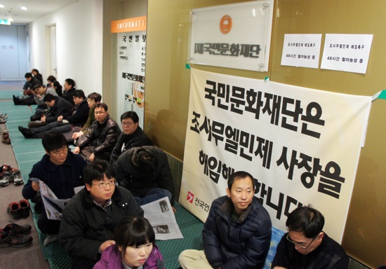 | ▲ 국민일보 노조 조합원들이 11일 오전부터 유일주주인 국민문화재단 앞에서 48시간 철야농성에 돌입했다. <사진=국민 노조 제공> | ||