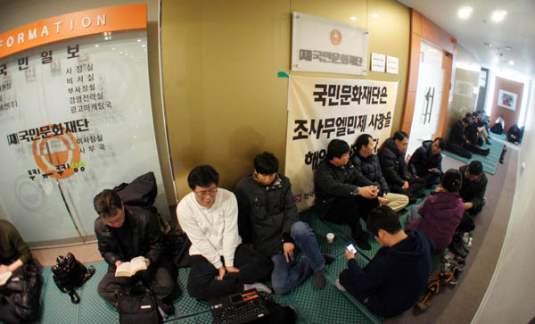 ▲ 국민일보 노조 조합원들이 11일 국민문화재단 앞에서 48시간 철야농성에 돌입하며 조민제 사장의 해임을 촉구했다. (국민 노조 제공) |