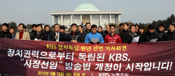 KBS 구노조는 13일 기자회견을 열고 ‘공영방송 KBS의 독립을 위한 이사회와 사장 선임 구조 개선 투쟁’을 선언했다. 이들은 “현행 KBS 사장과 이사 선임 방식이 정부여당의 정치 독점적 구조로 이뤄짐에 따라 방송에 대한 공정성 시비가 끊임없이 제기되고 있다”며 “방송법 개정을 통해 2012년을 KBS의 정치적 독립 원년으로 만들겠다”고 밝혔다.