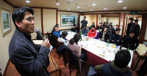 ▲ 국민일보 조상운 노조위원장이 19일 서울 여의도 한 음식점에서 열린 현안설명회에서 조합원들을 상대로 발언하고 있다. (국민 노조 제공) |