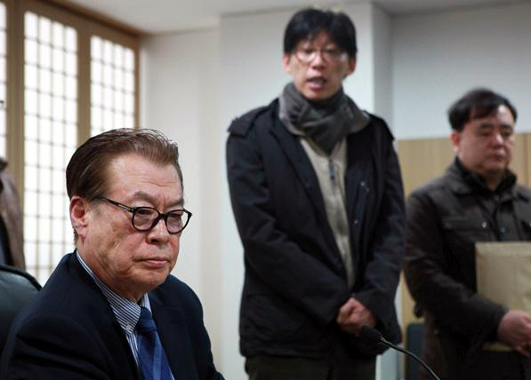 ▲ 방문진 임시 이사회가 열린 지난 14일, 회의에 앞서 MBC노조가 김재철 사장 해임안 의결을 촉구했으나 김재우 이사장(왼쪽)은 “노사 간의 일”이라며 이를 거절했다. (MBC노조 제공) |