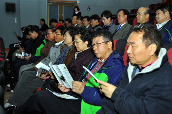 ▲ 재외동포기자단이 15일 경남고성공룡세계엑스포장 견학에 앞서 홍보영상을 보고 있다. |