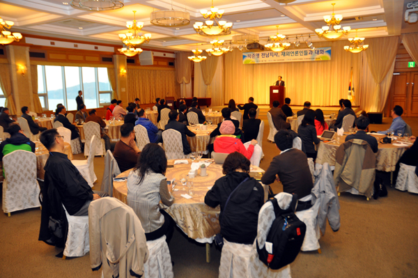 ▲ 박준영 전남도지사가 15일 여수 디오션리조트 3층 홀에서 재외동포기자들에게 환영의 말을 전하고 있다. |