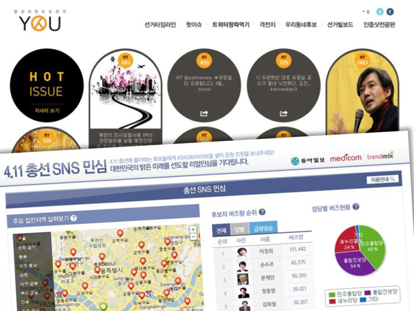 동아일보는 홍보대행사 미디컴과 함께 SNS상 선거 민심의 흐름을 측정하기 위해 ‘2012 트위터 민심 상황판’을 만들었다. 이 상황판은 전국 245개 지역구 내 주요 후보들의 SNS 민심을 실시간으로 보도한다.