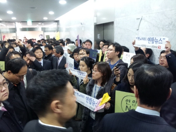 이날 오전부터 주주총회가 열리는 서울 수하동 센터원빌딩 앞에서 집회를 열고 주총장 앞에서 피켓시위를 벌이는 등 박 사장 연임을 반대해왔던 연합뉴스 노조는 “연합뉴스에 조종이 울렸다”며 퇴진투쟁 돌입을 선언했다.