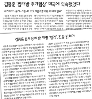 | ▲ 한겨레신문은 지난해 9월15일자 신문의 기사와 사설을 통해 김종훈 본부장의 쌀 개방 약속과 관련한 보도를 했다. | ||