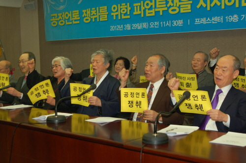 시민사회원로들은 29일 오전 서울 중구 한국프레스센터에서 기자회견을 열고 파업 중인 MBC·KBS·YTN·연합뉴스·국민일보 노조 조합원을 응원했다.
