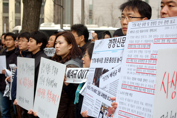 ▲ 2일 국무총리실이 있는 서울 세종로 정부종합청사 후문에서 YTN 노조 조합원들이 공직윤리지원관실의 YTN 사찰에 항의하는 시위를 벌이고 있다. |