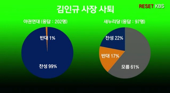 야권연대에선 202명 가운데 대다수인 199명이 김인규 사장 퇴진에 찬성 의사를 나타냈다. 새누리당 응답자 97명 가운데서도 22%인 21명이 김 사장 사퇴에 찬성했다. 사퇴에 반대한다는 의견은 17%였으며 61%는 잘 모르겠다고 응답했다.