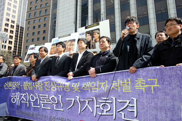 ▲ 이명박 정권 들어 해직된 언론인들과 언론노조가 5일 오전 서울 중구 태평로 한국프레스센터 앞에서 기자회견을 열고 언론장악 및 불법사찰과 관련해 책임자 처벌을 촉구했다. (언론노조 제공) |