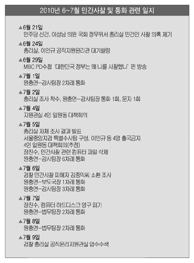 더욱이 원 사무관과 YTN 간부들의 통화가 집중적으로 이뤄진 2010년 7월1일부터 8일까지는 야당이 총리실 민간인 사찰 의혹을 공식 제기하면서 검찰 수사가 시작되는 등 상황이 숨 가쁘게 전개되는 시점이었다. 또한 이 기간 동안 사찰 자료들의 대대적인 폐기와 증거인멸이 이뤄졌다. 그와 간부가 무슨 이유로 여러 차례 통화를 했는지 의혹을 피할 수 없는 이유다.