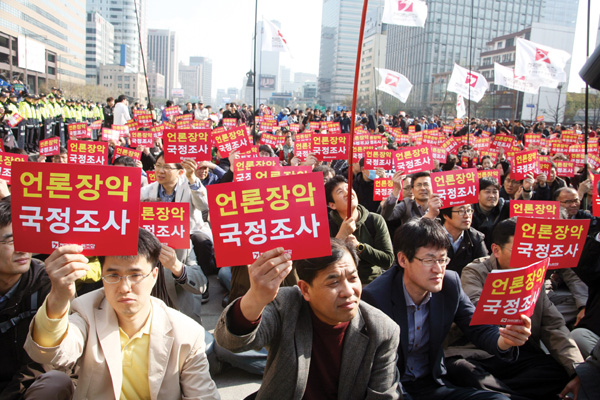 MBC, KBS, 연합뉴스 노조원들은 16일 서울 세종문화회관 앞에서 기자회견을 열어 “본격적인 싸움은 이제부터 시작”이라고 목소리를 높였다. 이강택 언론노조 위원장은 “새누리당이 총선 승리로 언론장악에 있어 면죄부를 받은 듯이 굴어선 안 된다”며 “박근혜 비대위원장이 구태를 청산하겠다고 한 만큼 대표적 구태인 언론장악 문제 해결을 위해 결단해야 한다”고 강조했다.