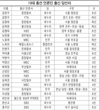 19대 총선에 출사표를 던진 언론인 출신 후보 55명 가운데 당선자는 지역구와 비례대표를 포함해 총 22명으로 집계됐다. 39명이던 18대에 비해 크게 줄어든 수치다.