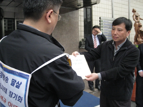| ▲ 국정조사 요구서를 전달하러온 YTN노조 조합원들을 맞은 사람은 '민원국' 명함을 내민 익명의 직원이었다. 오른쪽은 김종욱 노조위원장. | ||