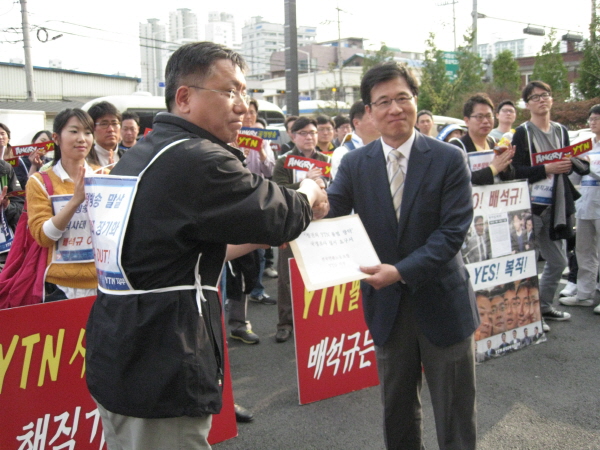 | ▲ 민주통합당 신경민 대변인(오른쪽)이 서울 영등포 당사 앞에서 국정조사 요구서를 전달받고 김종욱 YTN노조위원장과 악수를 나누고 있다. | ||