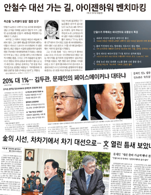 최근 가장 적극적인 출마보도는 중앙에서 나왔다. 중앙은 지난 16일자 1면 ‘안철수 “대선 출마 마음 굳혔다”’ 단독보도에서 안철수 원장의 출마를 기정사실화 했다. 안 원장이 한 야권 중진과 비밀리에 만나 출마 결심을 밝히며 대선캠프 동참을 요청했다는 것. 3면에서는 안 원장 측이 미국 아이젠하워 전 대통령 사례를 집중 연구하고 있다고 보도했다.