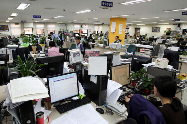▲ 한겨레 편집국 내부. 박찬수 편집국장이 기둥 앞 가운데에 앉아 있다. (한겨레 제공) |