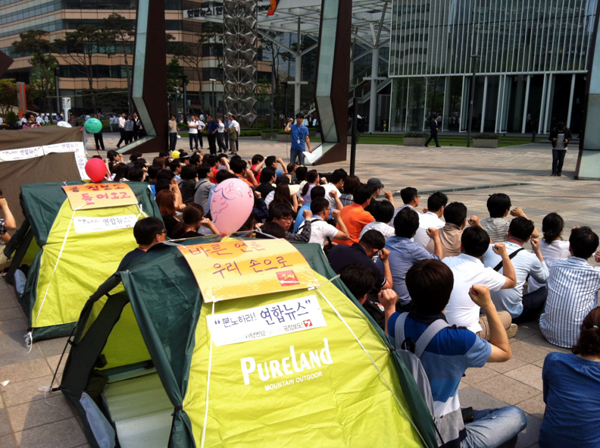 ▲ 연합뉴스 노조가 10일 오후 사옥 앞에서 박정찬 사장 거취에 대한 전 사원 여론조사 결과를 발표하고 천막 노숙농성에 들어갔다. |