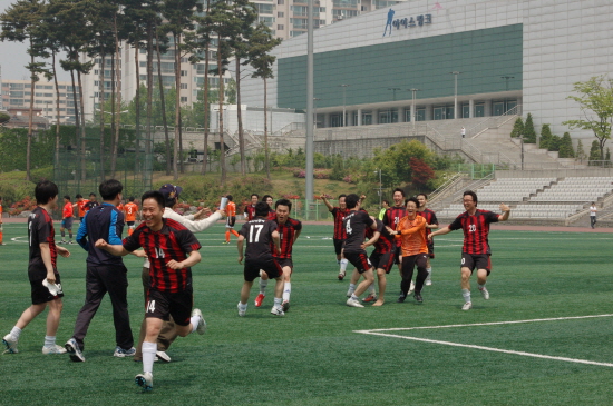 | ▲ 아시아경제 선수들이 중앙일보와의 승부차기에서 승리한 뒤 환호하고 있다. | ||
