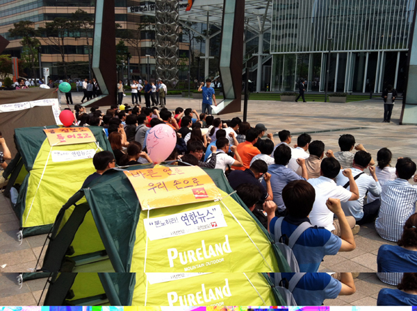 ▲ 연합뉴스 노조가 10일 오후 사옥 앞에서 박정찬 사장 거취에 대한 전 사원 여론조사 결과를 발표하는 기자회견을 갖고 천막 노숙농성에 들어갔다. |
