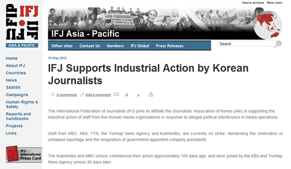 IFJ는 “한국 언론사 노조의 단체행동은 이명박 대통령이 이끄는 현 정부의 정치적 개입 의혹으로 촉발됐다”며 “이 대통령이 친정부 인사를 공영언론사 사장으로 임명해 한국 사회와 정부에 비판적인 프로그램과 보도를 폐지하도록 했다”고 지적했다.