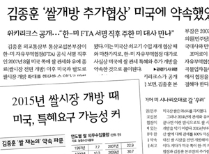 한겨레는 지난해 9월 15일자 위키리크스를 인용해 김종훈 전 본부장이 2007년 8월 한-미 자유무역협정 서명 직후 얼 포머로이 하원의원을 만나 대화내용을 담은 위키리크스 문서를 인용해 ‘김 전 본부장이 쌀 개방 추가 협상을 약속했다’는 의혹을 담은 기사와 사설을 보도했다.