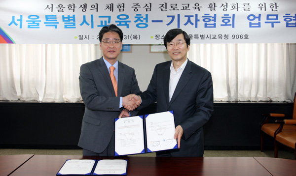 한국기자협회는 31일 재능기부 저널리스트에게 활동 기회를 제공하기 위해 서울시교육청과 ‘서울학생의 체험 중심 진로교육 활성화를 위한 업무협약’을 맺었다.