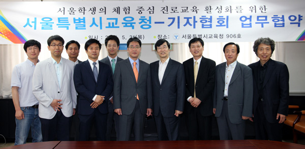 ▲ 31일 오전 서울시교육청에서 열린 서울학생의 체험 중심 진로교육 활성화를 위한 업무협약식 참석자들이 기념촬영을 하고 있다. 왼쪽부터 강윤중 경향신문 기자, 배성민 머니투데이 기자, 김성후 기자협회 기획팀장, 편상욱 SBS 기자, 정광재 MBN 기자, 박종률 기자협회 회장, 곽노현 서울시교육감, 김양옥 시교육청 평생진로교육국장, 이경균 공보담당관, 조 용 진로직업교육과장.(서울시교육청 제공) |