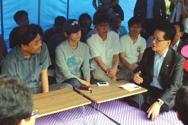 ▲ 민주통합당 박지원 비상대책위원장이 5일 단식농성이 벌어지고 있는 언론노조 희망텐트를 방문해 이강택 언론노조 위원장의 요구사항에 답하고 있다. |