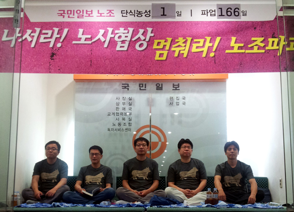 ▲ 손병호 노조위원장 직무대행 등 노조 지도부 5명은 사측에 성실협상을 촉구하며 5일 오후부터 무기한 철야단식농성에 돌입했다.(국민일보 노조 제공) |