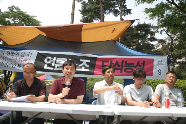 9일째 단식 중인 김현석 새노조위원장은 이날 여의도광장 단식농성장 앞에서 열린 기자회견에서 “새노조 위원장과 사장을 대표로 하는 노사동수의 대선 공정방송 위원회 설치에 노사가 합의함으로서 대선 국면에서 공정방송을 담보할 수 있는 강력한 수단을 가질 수 있게 됐다”며 “탐사보도팀 부활은 KBS의 권력감시 기능을 회복시킬 것”이라고 설명했다.