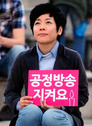 | ▲ 방송인 김미화씨가 지난달 4일 오후 서울 영등포구 여의도공원에서 전국언론노동조합 주최로 열린 '방송사 공동파업 시민문화제 여의도의 눈물'에 참석해 피켓을 들고 있다. (사진 뉴시스) | ||