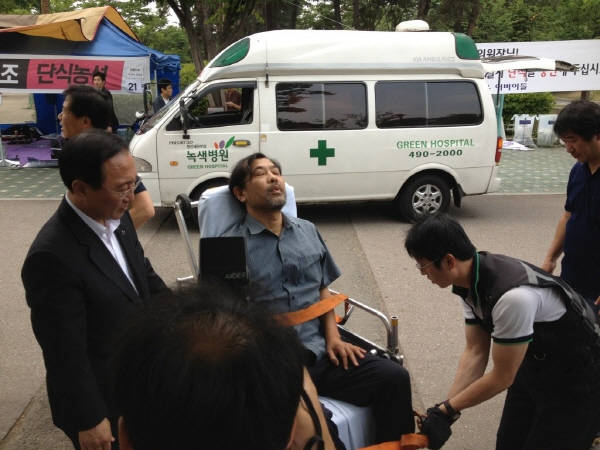 단식 14일째인 지난 11일에도 한 차례 응급실에 다녀온 이 위원장은 지난 주말을 지나며 건강상태가 급격히 악화됐다. 보건의료단체 관계자가 17일 농성장을 찾아 이 위원장을 진찰한 후 더 이상 단식을 이어갈 수 없는 상황이라며 단식 중단을 강하게 권유한 것으로 알려졌다. 결국 이 위원장은 18일 오후 1시 혈압 등에 이상을 보여 녹색병원으로 후송됐다.