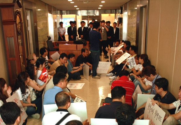▲ KBS 교양·다큐 PD들이 14일 KBS 본관 6층 사장실 앞에서 EP 보직해임 방침에 항의해 연좌 농성을 벌이고 있다. (KBS 새노조 제공) |