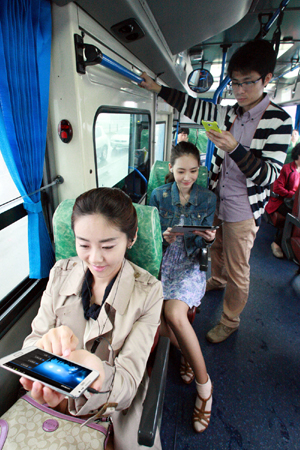 ▲ 버스 안 승객들이 스마트폰과 태블릿PC를 이용해 N스크린 서비스를 이용하고 있다. (연합뉴스) |