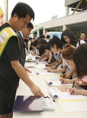 ▲ 26일 오후 경기 수원시 팔달구 수원역 앞에서 열린 ‘MBC 김재철 사장 퇴진 촉구 국민서명운동’에 시민들이 줄을 서 서명을 하고 있다. (뉴시스) |