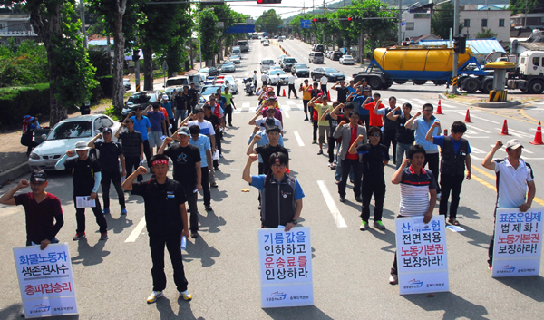 ▲ 25일 충북 청주역에서 열린 화물연대 청주지회 총파업 출정식에서 조합원들이 화물 운송 관련법 개정과 제도 개선, 기름값 인하, 운송료 인상을 촉구하고 있다. (뉴시스) |