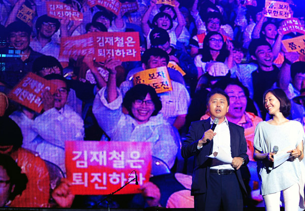 ▲ 지난달 30일 오후 서울광장에서 열린 김재철 MBC 사장 헌정콘서트 ‘전 그런 사람 아닙니다’에서 최일구 앵커와 김수진 기자가 관객들에게 인사를 하고 있다. (뉴시스) |