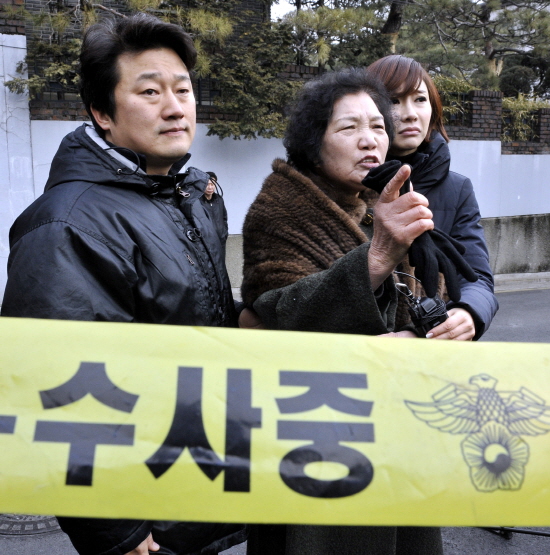 | ▲ MBC 이상호 기자(왼쪽)가 지난 1월 31일 오전 서울 서대문구 연희동 전두환 전 대통령 자택 앞에서 故 이한열 열사의 어머니 배은심 여사(가운데)와 전두환 전 대통령의 과거사 사죄 촉구 기자회견을 갖고 있다. 경찰들이 전 전 대통령 자택 주변에 수사 중이라고 적힌 노란 테이프를 쳐 놓고 있다. (사진 뉴시스) | ||
