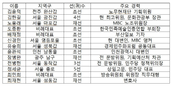 민주통합당 문방위원은 그밖에 김윤덕, 김한길, 노웅래, 도종환, 배재정, 신경민, 유승희, 윤관석, 장병완, 전병헌, 정세균, 최민희 의원 등 13명이다.