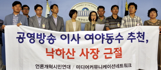 | ▲ 언론개혁시민연대와 미디어커뮤니케이션네트워크 회원들이 6일 오전 서울 여의도 국회 정론관에서 공영방송 이사 여야동수 추천 낙하산 사장 근절 기자회견을 열고 있다. (사진 뉴시스) | ||