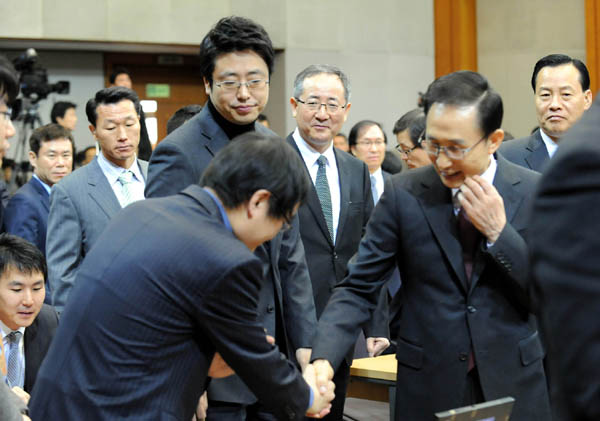 ▲ 종편사들의 청와대 풀기자단 가입이 험난하다. 사진은 지난 2월 청와대 춘추관에서 열린 이명박 대통령 취임 4주년 특별기자회견 때 이 대통령이 출입기자와 악수를 나누고 있는 모습. (뉴시스) |