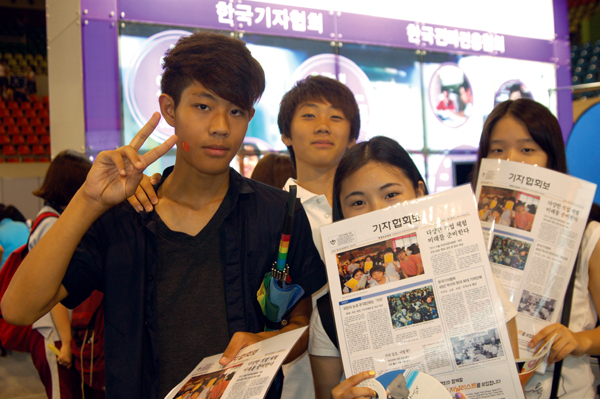 ▲ 한국기자협회가 마련한 ‘기자와 놀자’ 부스에서 신문제작을 체험한 학생들이 자신들의 사진이 들어간 기자협회보를 들고 포즈를 취하고 있다. |