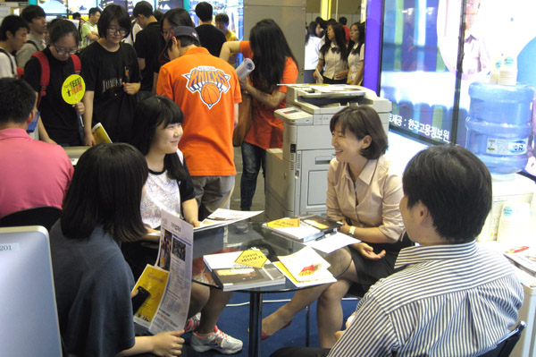 ▲ 14일 한양대학교 올림픽체육관에서 열린 ‘2012 서울진로직업박람회’에서 기자들이 학생들과 상담을 하고 있다. |