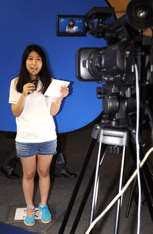 ▲ 지난 11일 한양대학교 올림픽체육관에서 열린 ‘2012 서울진로직업박람회’에서 학생들이 한국기자협회가 마련한 ‘기자와 놀자’ 부스에서 방송리포팅을 체험하고 있다. (뉴시스) |