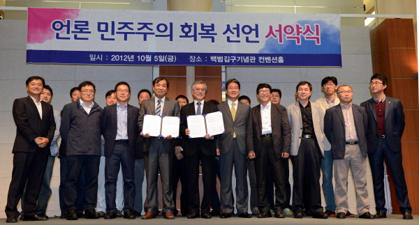 | ▲ 5일 서울 용산구 백범기념관에서 열린 '대선후보-언론3단체 언론민주주의 회복선언 서약식'에서 문재인 민주통합당 대선후보, 박종률 한국기자협회장, 이강택 전국언론노조 위원장, 이정식 한국PD연합회장을 비롯한 YTN 해직기자 등이 언론민주주의 회복선언문을 들고 기념촬영을 하고 있다.(뉴시스) | ||
